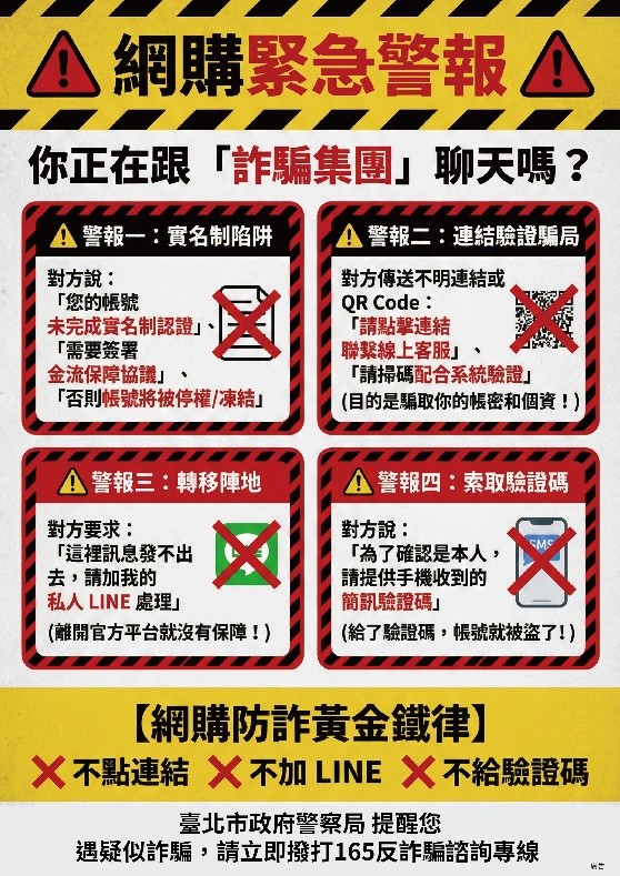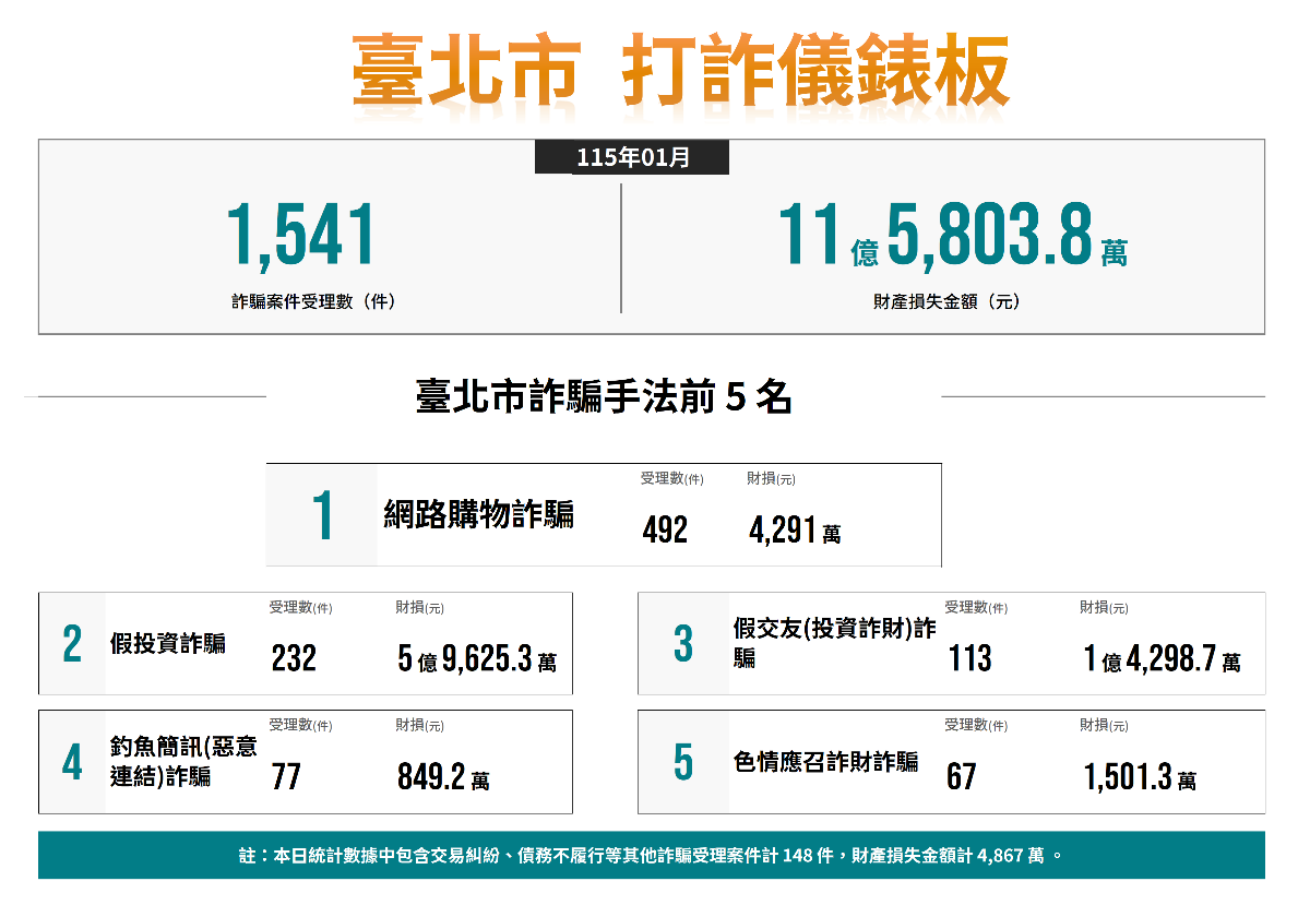 校園公告 公告主旨 打詐臺北隊115年2月反詐宣導素材 發佈日期 2026 年 2 月 10 日 發佈單位 生活教育組 公告類別 行政公告 公告等級 公告 點閱次數 70 公告內容 說明: 一、依據本府警察局115年2月4日北市警刑經字第11530306124號函辦理。 二、經分析本市115年1月各類詐欺案件發生數共計1,541件,財損金額新臺幣(以下同)11億5,803.8萬元,前3大高發詐欺手法受理件數及財損金額: (一)網路購物詐騙492件,財損4,291萬元。 (二)假投資詐騙232件,財損5億9,625.3萬元。 (三)假交友(投資詐財)詐騙113件,財損1億4,298.7萬元。 三、近期發現詐騙集團常用「網路購物詐騙」、「假客服」等方式,誘導民眾匯款或轉帳,為避免詐騙集團藉以行騙,爰彙整宣導圖文素4張(含115年1月打詐儀錶板數據、4格漫畫案例、宣導傳單)、影片1部及製作跑馬燈文字稿(如附件),作為115年2月宣導主軸,並上傳Google雲端連結供下載,以提升識詐宣導廣度。 相關附件 【2026-02-11】避免於公務環境安裝及使用具風險之應用程式 【2026-02-09】使用校園繳費系統及推動學校場域無現金繳納學雜費-悠遊付獎勵活動
