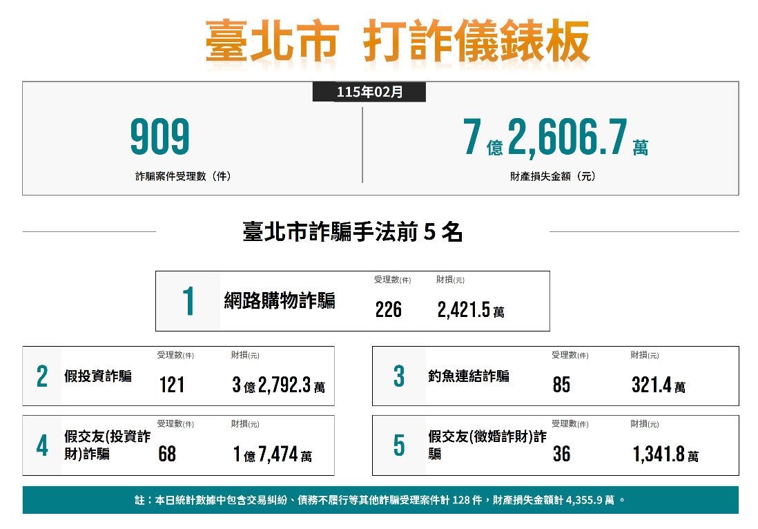 二、經分析本市115年2月各類詐欺案件發生數共計909件,財損金額新臺幣(以下同)7億2,606.7萬元,前3大高發詐欺手法受理件數及財損金額: (一)網路購物詐騙226件,財損2,421.5萬元。 (二)假投資詐騙121件,財損3億2,792.3萬元。 (三)釣魚連結詐騙85件,財損321.4萬元。