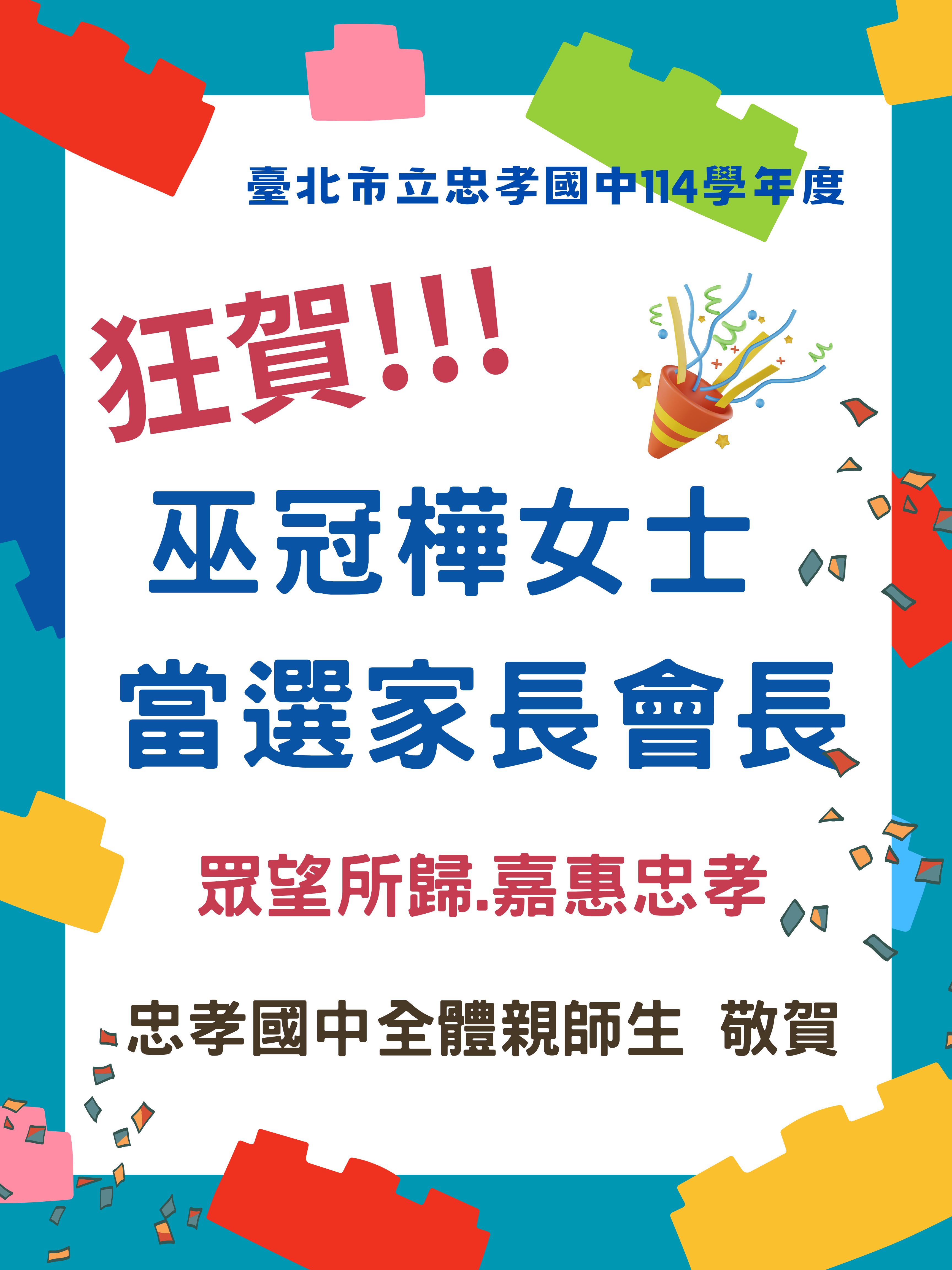校園公告 公告主旨 114學年度家長會 發佈日期 2025 年 10 月 07 日 發佈單位 輔導室 公告類別 行政公告 公告等級 公告 點閱次數 452 公告內容 恭喜巫冠樺女士連任家長會長,感謝您113學年度帶領的家長會,給予學校滿滿地支持和協助,114學年度也請多多支持喔~ 也祝賀各年級副會長,大家一起努力 相關附件 114家長會當選海報1 114家長會當選海報1 檔案名稱檔案大小檔案格式下載114家長會當選海報1.jpg740.38 KB新視窗開啟檔案114家長會當選海報2.jpg840.88 KB新視窗開啟檔案 114家長會當選海報1.jpg114家長會當選海報2.jpg 【2025-10-07】「2025臺北101國慶煙火暨無人機展演」禁止遙控無人機飛航活動公告 【2025-10-06】GEPT 新年度初級、中級測驗報名資訊,歡迎同學踴躍參加考試!